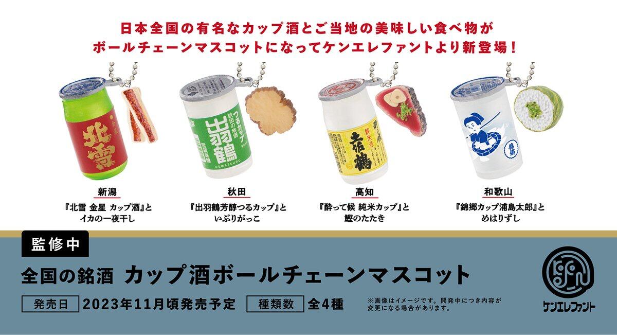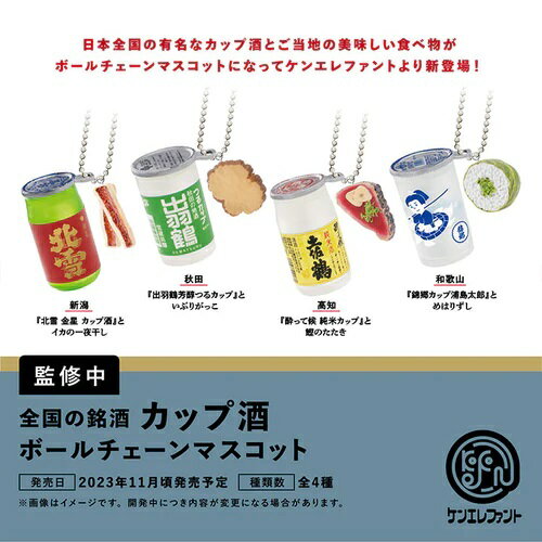 全国の銘酒 カップ酒 ボールチェーンマスコット 全4種 【商品内容】 01.新潟『北雪 金星 カップ酒』とイカの一夜干し 02.秋田『出羽鶴芳醇つるカップ』といぶりがっこ 03.高知『酔って候 純米カップ』と鰹のたたき 04.和歌山『錦郷カップ浦島太郎』とめはりずし ★メーカー:ケンエレファント ★ミニブック付属