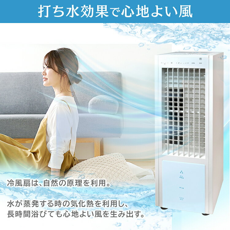 打ち水効果で、からだにやさしい自然な風を発生させる冷風扇です。クーラーだと部屋が寒くなるからという方にもおすすめ。風量は3段階切替が可能、オートルーバーでお好きなところへ風を送れます。最大7.5 時間の切りタイマー付きで自然風、おやすみ風を選べます。保冷剤パック2個付き。[検索用:冷風機 リモコン 冷風扇 消臭 除菌 テクノス キャスター付 打ち水効果 スリムタイプ