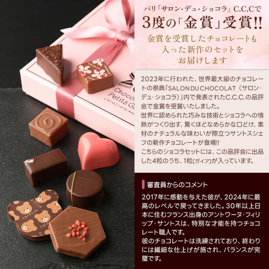 2023年の世界最大級のチョコレートの祭典「SALON DU CHOCOLAT(サロン・デュ・ショコラ)」内で発表されたC.C.C.の品評会でも金賞を受賞!チョコレートの達人の新作ショコラ。