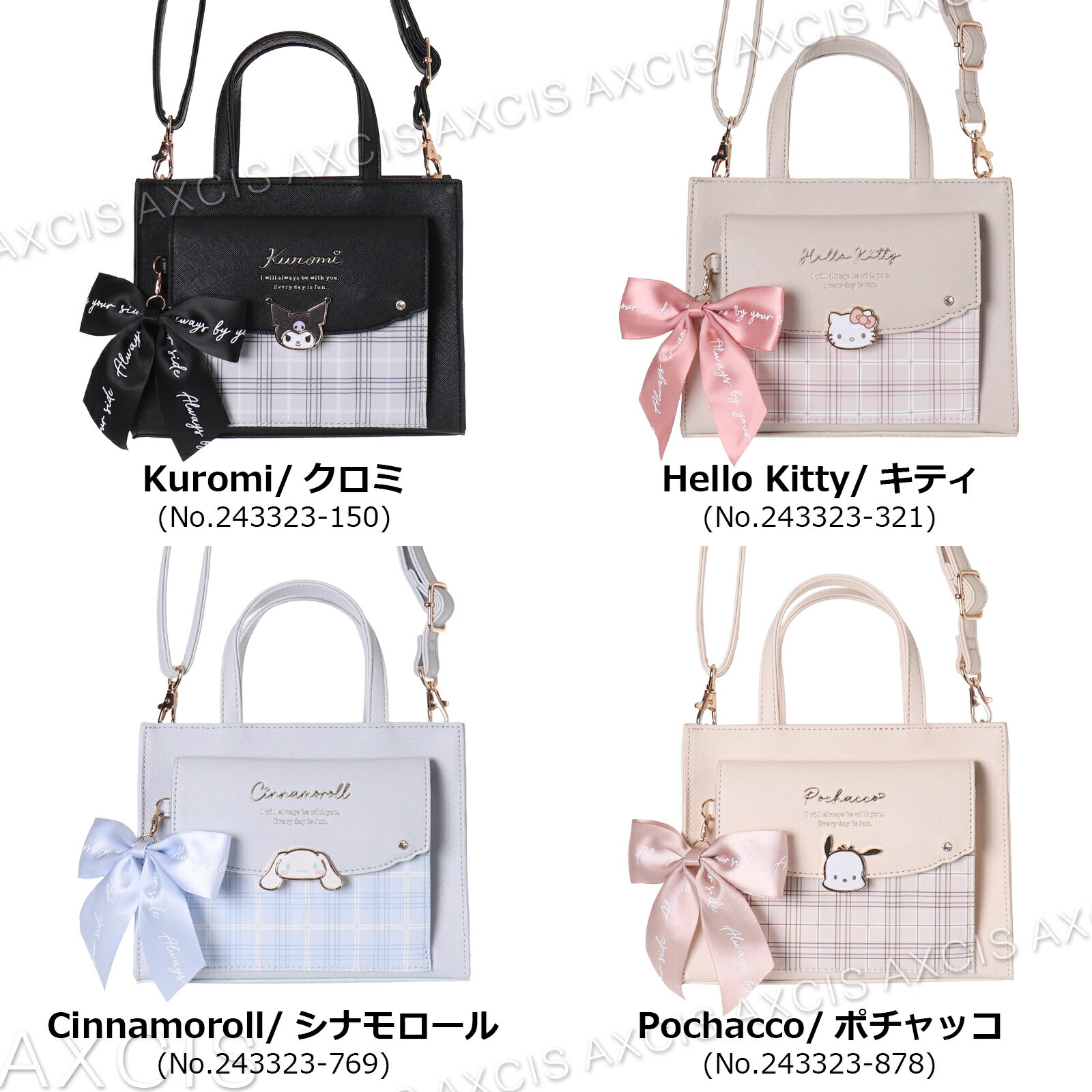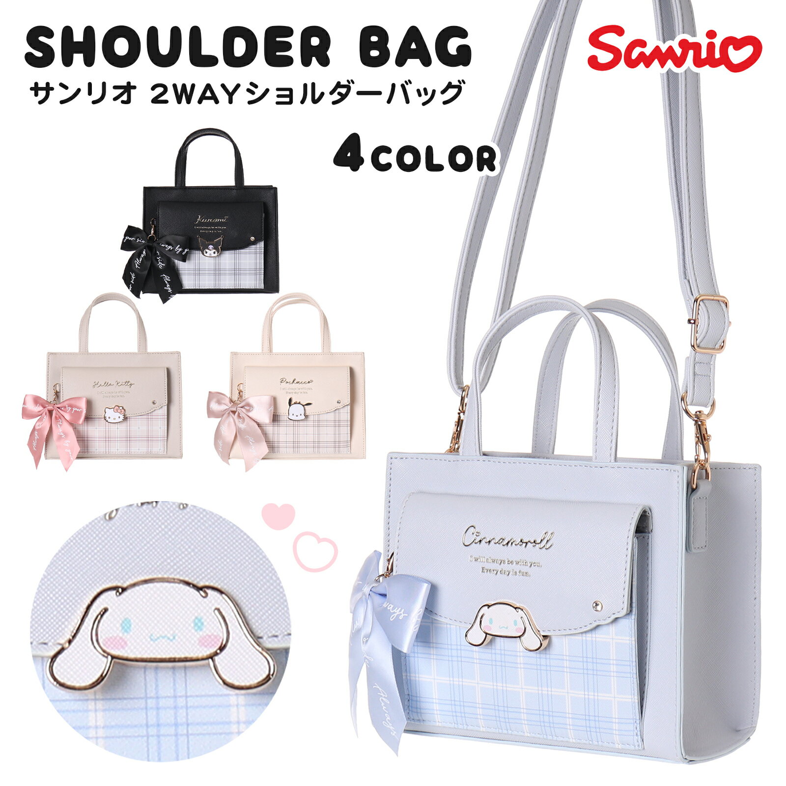 | 【3月下旬予約販売】サンリオ SANRIO 2WAYショルダー クロミ シナモロール ポチャッコ チェック プレート リボン付き 合皮 | ||