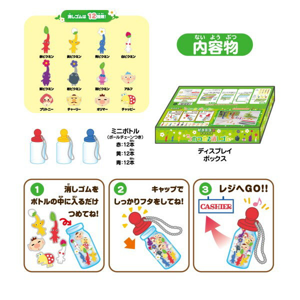 大人気Nintendo Switchソフト「ピクミン3 デラックス」のつめつめ消しゴムが新登場!ボトルに入る分だけ、ちいさな消しゴムを自由につめて購入します。購入後は、ボトルごとに飾ってもよし、消しゴムとして使うのもよし。遊び方が広がります。