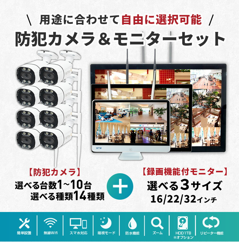 【★最大8TB★6/20限定 抽選で100%Pバック】WTW 塚本無線 防犯カメラ ワイヤレス 屋外 1~10台 大型モニター 録画機能付 16インチ 22インチ 32インチ wifi 無線 防犯カメラセット 家庭用 監視カメラセット ディスプレイ一体型 工事不要 スマホ Par