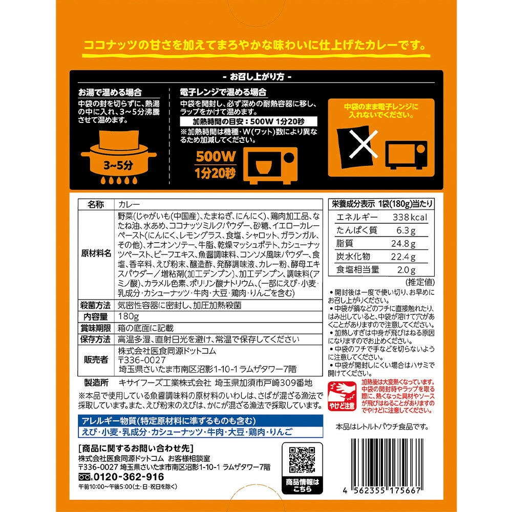 特徴 フジテレビの人気番組「芸能人が本気で考えた!ドッキリGP(グランプリ)」から生まれたキャラクター”記憶ゼロヒーロー!『マッサマン』とのコラボ商品! 『マッサマン』こと、Snow Man向井康二、本人が扮したキャラクターシールの特典付き! ●ココナッツの甘さを加えてまろやかな味わいに仕上げたカレーです。 ●大人も子どもも楽しめる!辛口と辛さ控えめなマイルド味の2種展開! 殺菌方法 気密性容器に密封し、加圧加熱殺菌 原材料名 野菜(じゃがいも(中国産)、たまねぎ、にんにく)、鶏肉加工品、なたね油、水あめ、ココナッツミルクパウダー、砂糖、イエローカレーペースト(にんにく、レモングラス、食塩、シャロット、ガランガル、その他)、オニオンソテー、牛脂、乾燥マッシュポテト、カシューナッツペースト、ビーフエキス、魚醤調味料、コンソメ風味パウダー、食塩、香辛料、えび粉末、醸造酢、発酵調味液、カレー粉、酵母エキスパウダー/増粘剤(加工デンプン)、加工デンプン、調味料(アミノ酸)、カラメル色素、ポリリン酸ナトリウム、(一部にえび・小麦・乳成分・カシューナッツ・牛肉・大豆・鶏肉・りんごを含む) 保存方法 直射日光、高温多湿を避けて、保存してください。 お召し上がり方 ●お湯で温める場合 中袋の封を切らずに、熱湯の中に入れ、3〜5分沸騰させて温めます。 ●電子レンジで温める場合 中袋を開封し、必ず深めの耐熱容器に移し、ラップをかけて温めます。 加熱時間の目安:500W 1分20秒