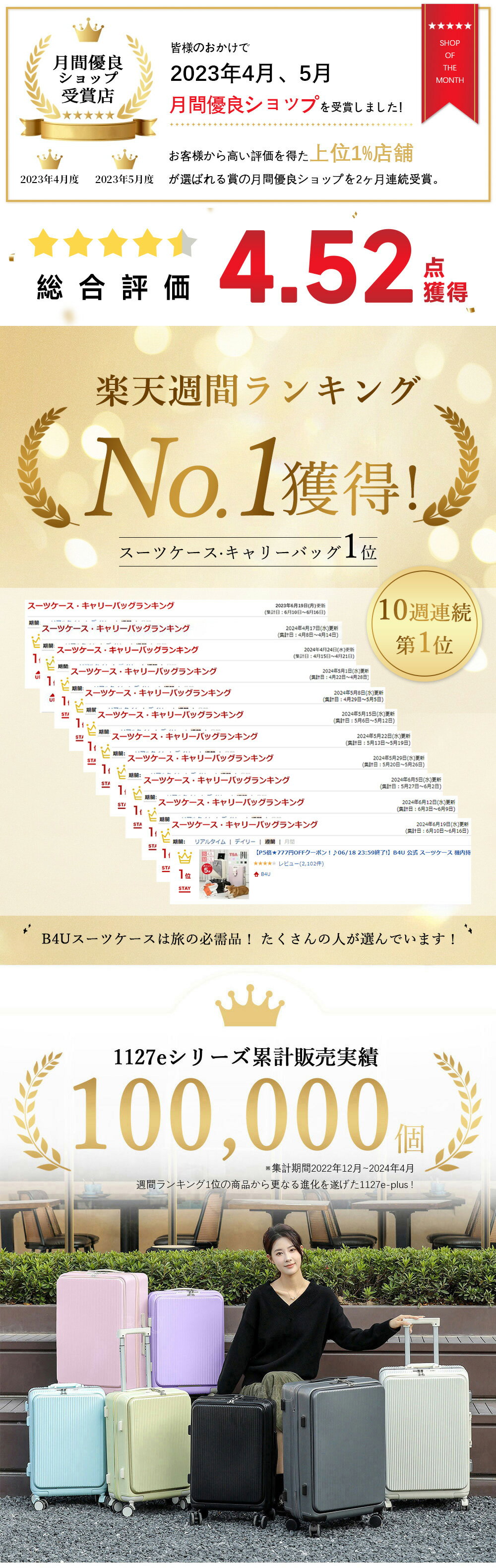 | 【P5倍★1000円OFFクーポン!♪06/24 10:00終了!】B4U 公式 スーツケース 機内持ち込み 修学旅行 フロントオープン キャリーケース Sサイズ Mサイズ 20インチ 24インチ ストッパー 多機能 USBポート カップホルダー 静音 軽量 キャリーバッグ ファスナー 大容量 正規品 大型 | ||