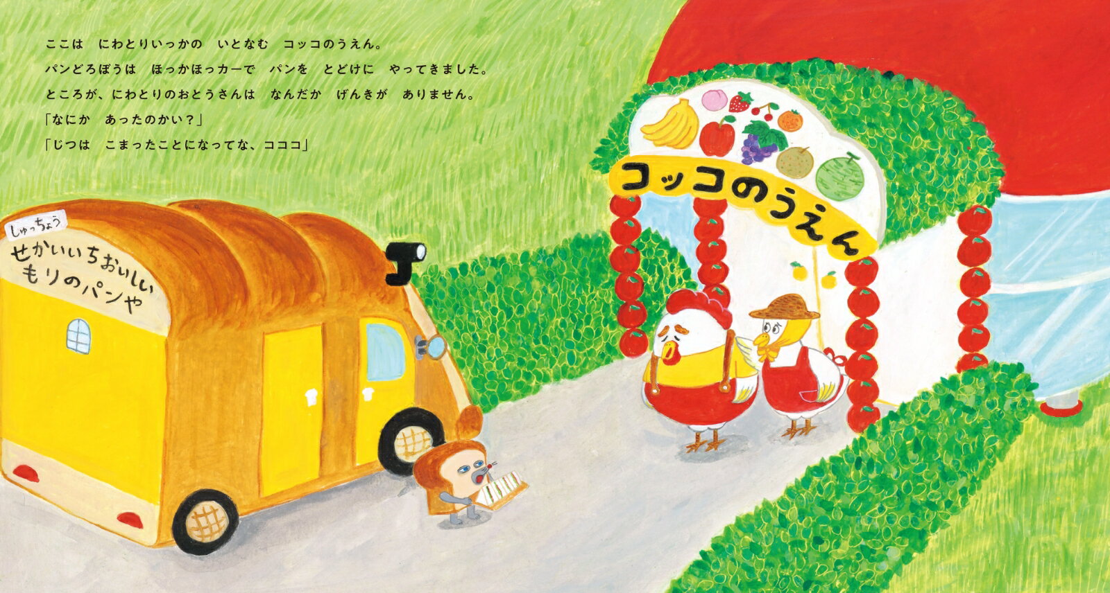 にわとり一家がいとなむコッコ農園へ、パンをとどけにやってきたパンどろぼう。