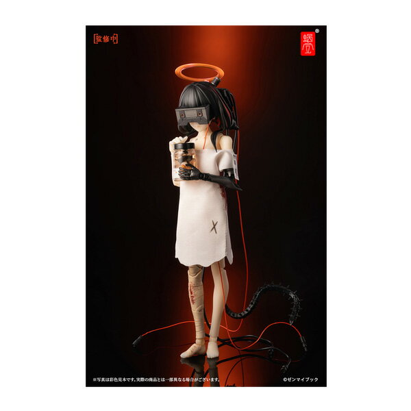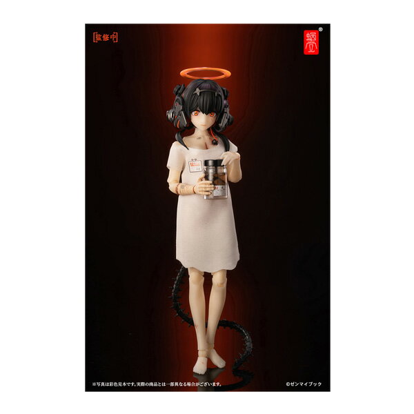 商品詳細 イラストレーター「ゼンマイブック」先生のオリジナルキャラクター「三猿」の3人が、それぞれアクションフィギュアとして商品化です!・本体とは別に付け替えフェイスパーツが1個付属します。設定上三猿は同じ容姿となっているので、付け替えフェイスパーツは三猿の別キャラにも取り付けられます。「言わざる」のフェイスパーツはフル可動眼球付きで、付属の「視線替え用ミニツールNEO」で視線を変更できます。・眼球には蛍光色、髪飾りとヘイローには蛍光材質を使用しており、ブラックライトで照らすと発光します。・本体とは別に付け替え用ハンドパーツが3セット付属します。(※「繋ぎ」のハンドパーツは、他の三猿キャラと手を繋げる際に使用できます。)・本体に布製の服を着用しており、ウェザリング・血痕・タグなどのディテールはすべてプリントで細かく再現されています。・同メーカーのアクションフィギュアシリーズ「バニーガール アイリン」(別売り)と同じ引き出し式股関節を採用し、広範囲の可動を実現しました。フィギュア本体×1 フル可動眼球付フェイスパーツ×1(大笑い、本体装着分含まず)ヘイロー×1標本瓶×1メカテール×1視線替え用ミニツールNEO×1付け替え用ハンドパーツ×3セット(瓶抱え・握り・繋ぎ)クリア台座×1支柱×1クリップ×1支柱延長パーツ×1原型製作—サイズ1/12スケール (全高:約140mm)商品仕様PVC/ABS/POM/ワイヤー/布製 塗装済み完成品アクションフィギュアパッケージ