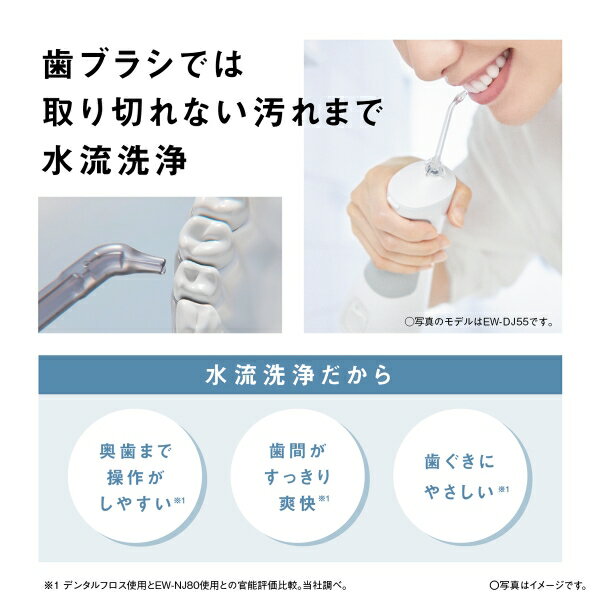 付属品 ・超音波水流ノズル 1本 ・ポイント磨きノズル 1本 ・舌磨きノズル 1本 ・ACアダプター ・充電スタンド 商品詳細 メーカー名 Panasonic 品番 EW-DJ55-W サイズ 高さ31×幅7.5×奥行き8.5cm(舌磨きノズル含む) スペック 防水性能○(IPX7) 海外使用○*1 タンク容量約200mL 給水1回での使用時間超音波水流ノズル 約1分 ポイント磨きノズル 約55秒 舌磨きノズル 約40秒 (水圧レベル「5」設定時) 電源方式充電式 充電時間約1時間 定格電圧AC100-240V 50-60Hz 消費電力約10W(充電時) 使用時間約1時間フル充電で約10分間使用可能 商品説明 歯ブラシで取り切れない、歯周ポケット・歯間の汚れまで水流洗浄。お風呂で使えるハンディ・防水※1タイプ。 歯ブラシで取り切れない汚れまで、水流洗浄 様々なシーンで使いやすい、お風呂で使える防水※1・ハンディタイプ ※1 IPX7等級(水深1メートルに30分間水に浸けても有害な影響を生じる量の水の浸入がない)検査をクリアしています。