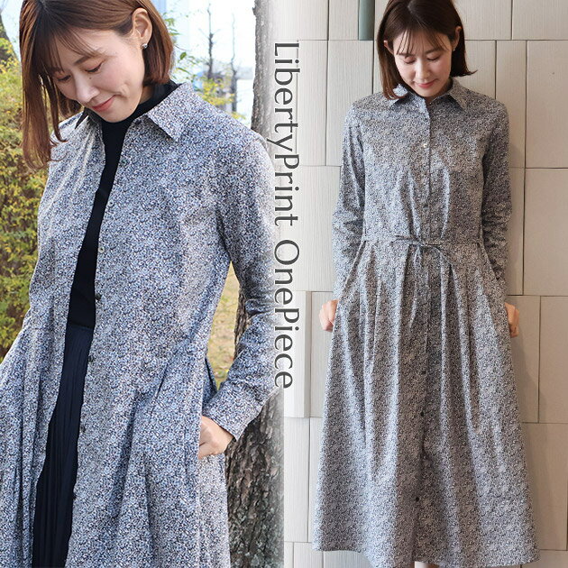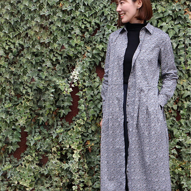 | リバティプリント ワンピース シャツ衿前開きタックOP(プリムラ)アッシュグレイ 限定カラー すっきり タナローン 羽織 LIBERTY PRINT使用 | ||