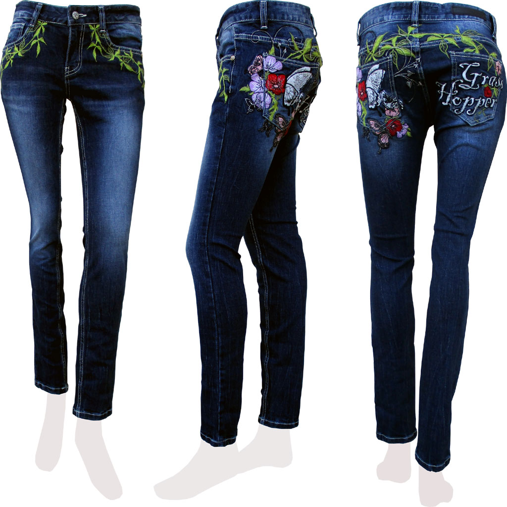 | grasshopper/グラスホッパー #674 レディース オールシーズン 美脚ストレッチスキニーデニム/ジーンズ 銀糸/刺繍/羽根/蝶/バタフライ/ロゴ/植物/ボタニカル/花/フラワー インディゴ/ブルー 25-30インチ | ||