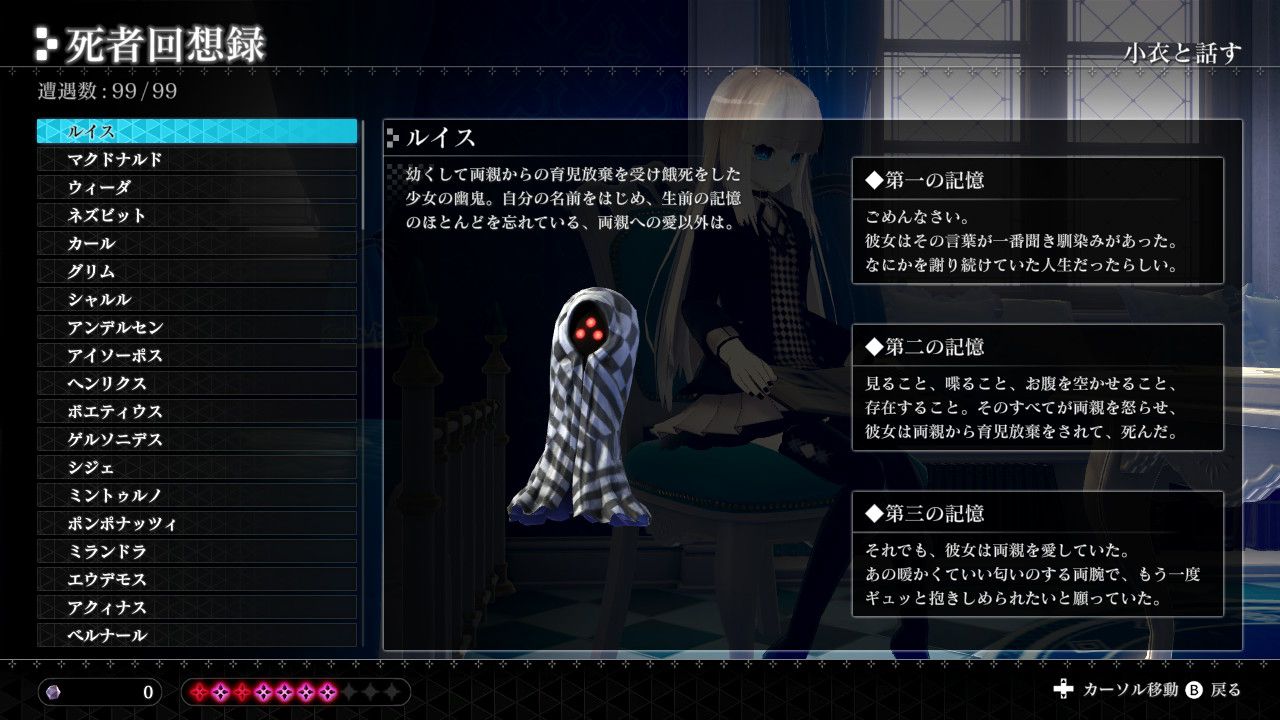 現実の自室に戻り、倒した魂の最期を思いながら一人涙を流すことで断末魔を浄化することができる。抱えた業を乗り越えることで精神的に成長し、辺獄で装備することができる「思装」を生み出す。