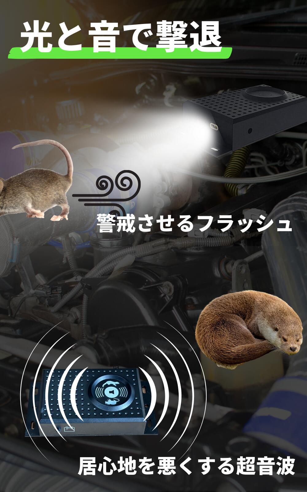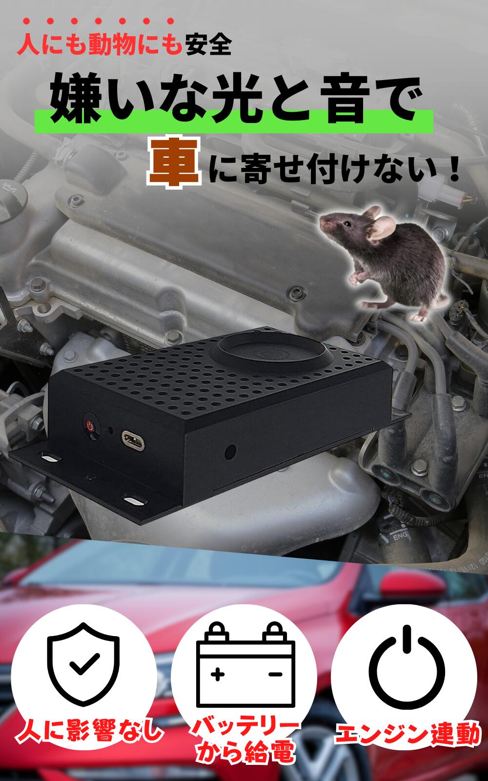| ISOTRONIC 車載ネズミ駆除 エンジンルームの動物撃退 フラッシュと超音波で撃退 カーバッテリーまたは電池から給電でどこでも設置 吊るせる 有効範囲60平方メートル 78580 | ||