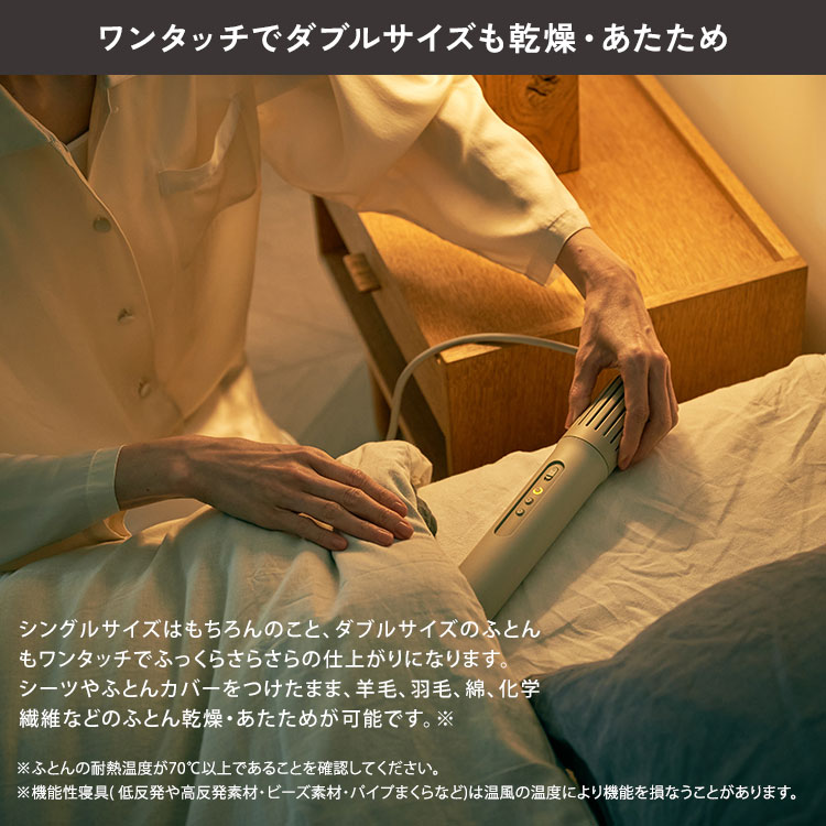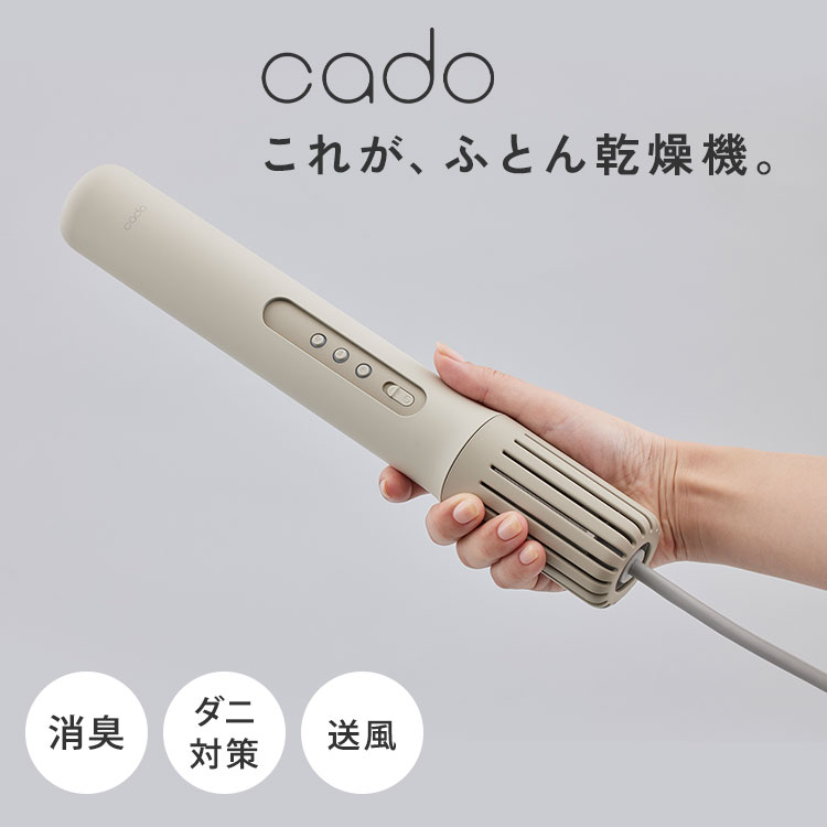 空気をデザインするcadoが、ふとん乾燥機のイノベーションに挑戦!コンパクト&軽量なので、使用も収納も手間知らず。布団に挿し込むだけで、除菌・消臭されたふっくらさらさらな快眠環境が作れます。忙しい朝も簡単ワンタッチでベッドクリーニングをお任せ。温度過昇防止装置搭載で安全性も徹底的に追求。マット塗装に柔らかなウォームグレーカラーは寝室に馴染みやすく、使わないときはベッドサイドに置いていてもインテリアの邪魔をしません。 商品紹介 ワンタッチでパワフル温風 コンパクトボディで高風圧と高風速を実現。確かな風圧と風速だから、ダブルサイズのふとんも隅々まで暖めます。※ダブルサイズのサーモグラフィー検証結果●温風の温度・あたためコース/乾燥コース:約55℃・ダニ対策コース:約60℃ 特許出願済のダイナミックエアロ機構 これまで空気のプロとして培ってきた技術を応用することで、従来の概念を覆す革命的なふとん乾燥機を開発することに成功しました。 業界初!オゾン消臭機能搭載 人体に無害とされる低濃度のオゾン(0.05ppm以下)が反応し、ふとんの除菌・消臭を行います。※オゾン消臭機能:乾燥コース/ダニ対策コース/送風コースでは対応。※業界初:家庭用ふとん乾燥機においてcado社調べた結果。(2023年8月現在)※低濃度:送風モードにて、気体検知管による吹出し直近のオゾン濃度を測定。(cado社試験) ニオイ・菌・ダニ・湿気を対策 気になるニオイや菌を除去し、ダニ対策まで。花粉の気になる春、ジメジメした梅雨、寝汗のかきやすい夏、布団が冷たくて寝つきの悪い秋冬、オールシーズン活躍します。※汗臭の消臭効果試験:疑似汗臭(アンモニア、酢酸、イソ吉草酸の混合臭気)を付着させた試験布を枕に貼り付け、送風モードでオゾン消臭運転。臭気判定士および複数名のパネラーにて6段階臭気強度法にて評価。(cado社調べ)※全てのニオイ・菌・ダニを除去できるわけではありません。 365日使いやすいデザイン あたため・乾燥・オゾン消臭・ダニ対策、ワンタッチで全部できるオールインワン機。忙しい毎日の中でも習慣化しやすく、365日ライフスタイルに寄り添って快眠をサポート。 コンパクト&軽量なスティック形状 使用も、収納も、持ち運びまでストレスフリー。使いやすさはもちろん、使わない時はベッドサイドに置いていてもインテリアの邪魔をしません。部屋間の移動、旅先や出張先への携帯も快適。 省エネ&安全性を徹底追及 これだけパワフルなのに、消費電力は業界最小クラスの420W。毎日使っても、1ヶ月の電気代は約396円。一定時間が経つと自動的に停止します。皆様に安心してお使いいただくため、通常の家電安全設計レベルを超えるデザインを盛り込んでいます。※消費電力:ダニ対策コース、室温25℃で運転した時の数値。※電気代:1日1時間程度の使用、31円/kWhにて試算。 使い方もお手入れも簡単 ふとんマットやホースの設置は要らなく、スイッチオンしてボタンを押すだけ。 ●あたため 黄色(10分) 寝るま前に素早く布団を温めたい時 ●乾燥 オレンジ色(60分) 布団をしっかり乾燥させたい時 ●ダニ対策 赤色(80分) 布団のダニ対策をしたい時 ●送風 青色(120分) 布団や枕の気になるニオイを取りたい時 ※乾燥できる布団サイズ目安:・敷き布団:シングル(約100×210cm)/ダブル(約140×210cm)・掛け布団:シングル(約150×210cm)/ダブル(約190×210cm) お手入れしたい時はフィルターカバーを外し、乾いた布や柔らかいブラシなどでホコリやゴミを取り除いたらOK。 サイズ 横幅 奥行き 高さ 約4.9cm 約4.9cm 約31.5cm