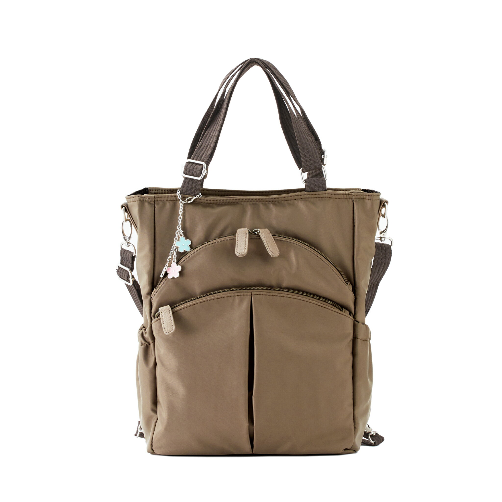 <外側>前面:ファスナーポケット×1(内側:キーストラップ×1)、サイド:オープンポケット×2、背面:ファスナーポケット×1