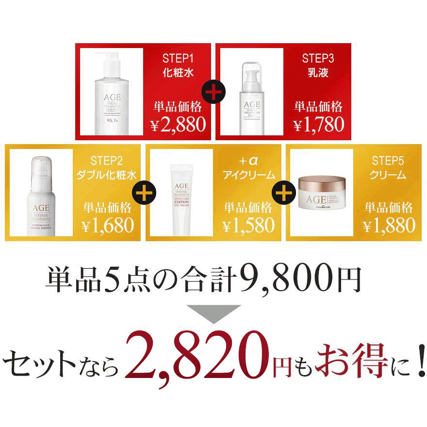 | 【Autumn Sale 20%OFF】【フロムネイチャー公式】AGE エイジインテンストリートメント ジンセンゴールドエディション 5点セット (化粧水+クリーム+化粧水+乳液+アイクリーム 合計5点) スキンケアセット ガラクトミセス 高保湿 潤い 弾力肌 age【楽天海外通販】 | ||