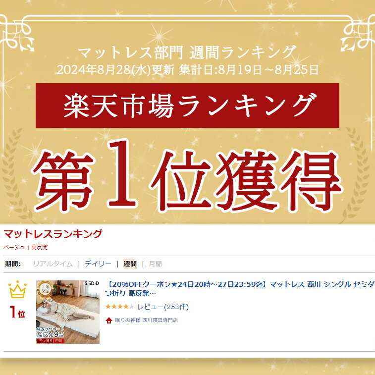 | 【1,500円OFFクーポン★~24日23:59迄】[楽天ランキング1位]マットレス 西川 シングル セミダブル ダブル フェスタ2 三つ折り 高反発 西川 折りたたみ 厚さ9cm 腰痛対策 硬め 抗菌 防臭 ウレタン 高反発マットレス 敷布団 健康マットレス 保証 | ||
