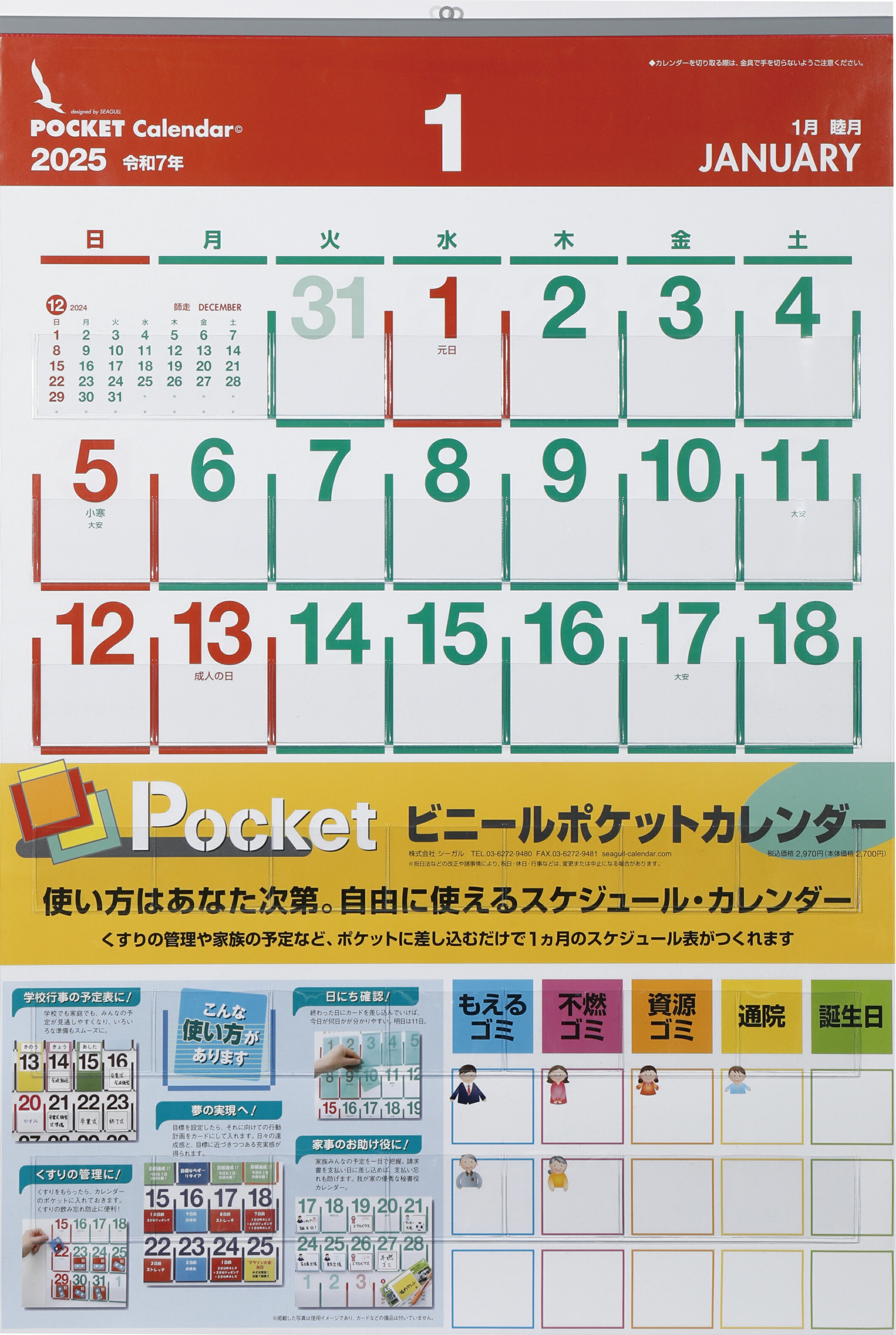 | ★カレンダーの前部分にビニールポケットがあり絵カードを入れられます。自閉症の方への月刊スケジュールの提示に便利! | ||