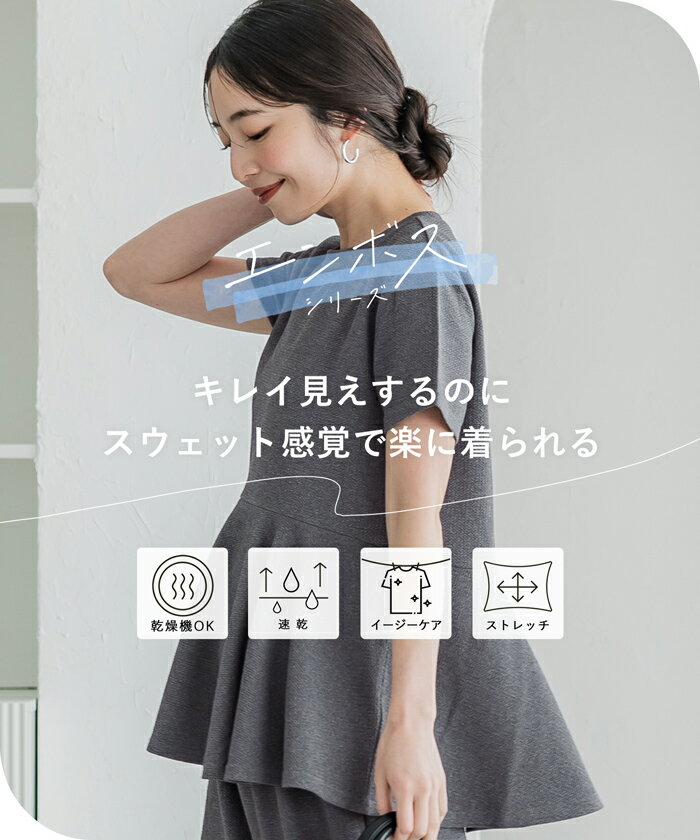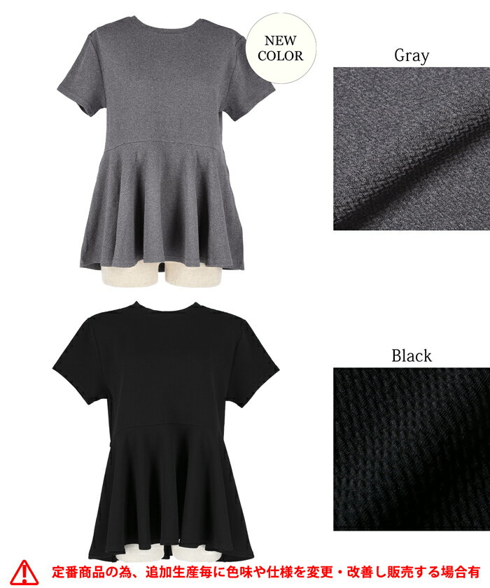| ★(トップス プルオーバー エンボス加工 ペプラム 半袖カットソー チュニック 切り替えフレア ラウンドネック 凹凸 伸縮性 ストレッチ 速乾 きれいめ) | ||