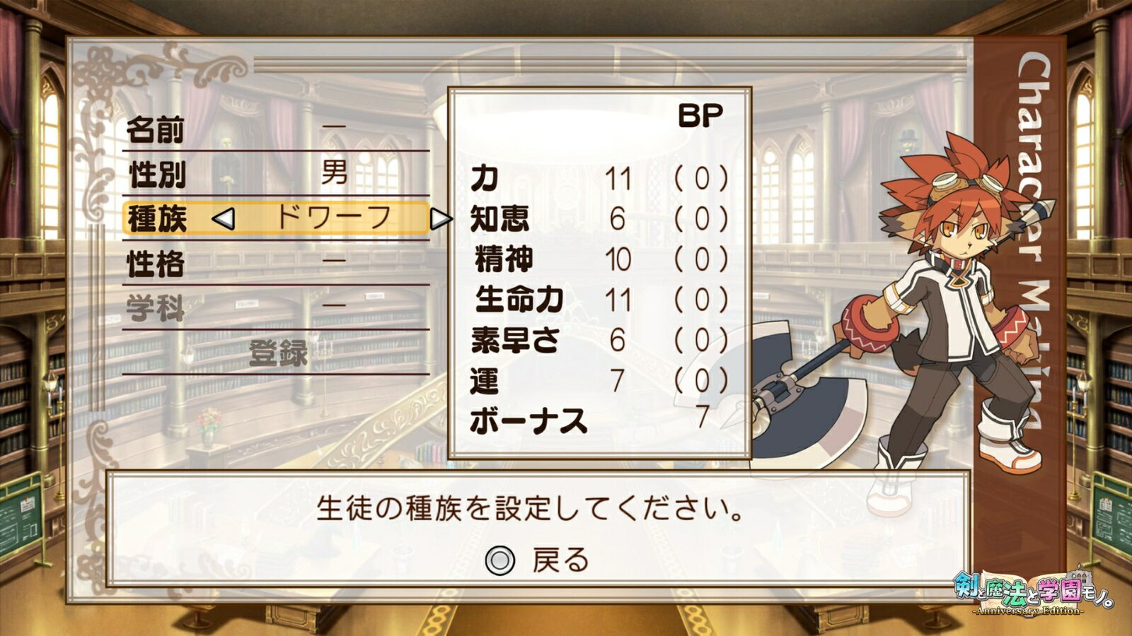 10の種族・男女・様々な学科を組み合わせ、自分だけのキャラクターを作成可能