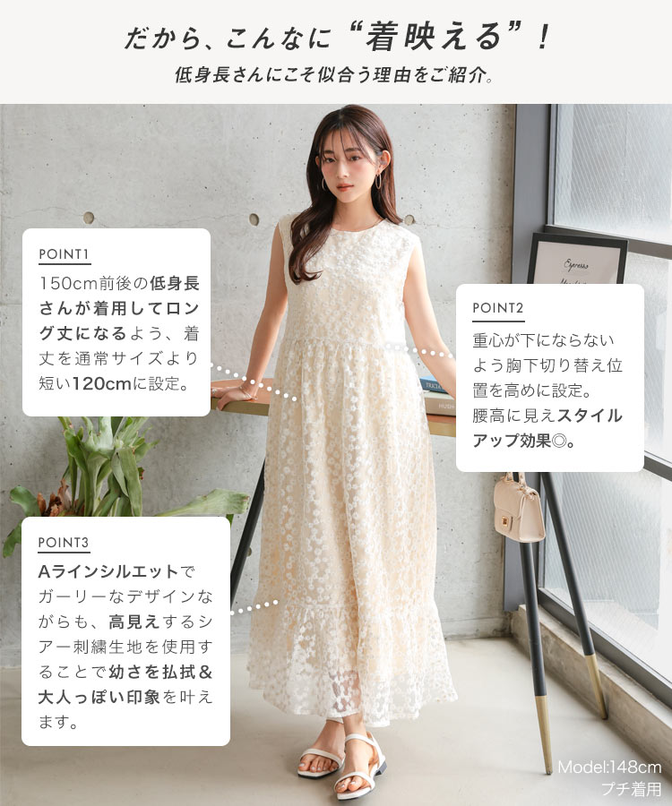 | ≪7/18 新発売!!3990円 送料無料≫ 低身長さん向け ワンピース [ Petitle プチレ ] 花柄刺繍シアーワンピース [E3505] レディース 20代 30代 40代 夏 ワンピ ノースリーブ ノースリ ロング丈 マキシ丈 シアー 低身長 低身長コーデ 低身長向け 低身長向けサイズ【送料無料】 | ||