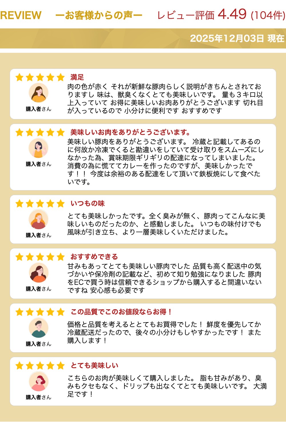 | ★ただのスライス豚小間じゃない!肉厚な肉を使った贅沢な旨味とやわらかさ。冷蔵で届くから、お好みの量に小分けにして冷凍保存がおススメ! | ||